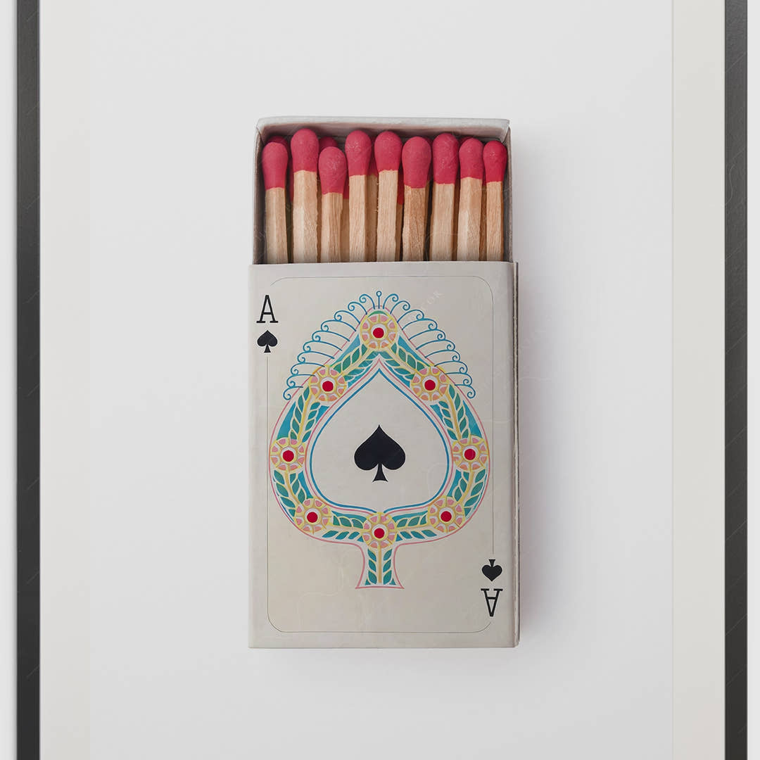 This striking wall art print features a vintage matchbox adorned with the iconic Ace of Spades. A bold symbol of luck and mystery, this design adds a touch of retro charm and timeless intrigue to any space, perfect for those who love a mix of classic and modern aesthetics.