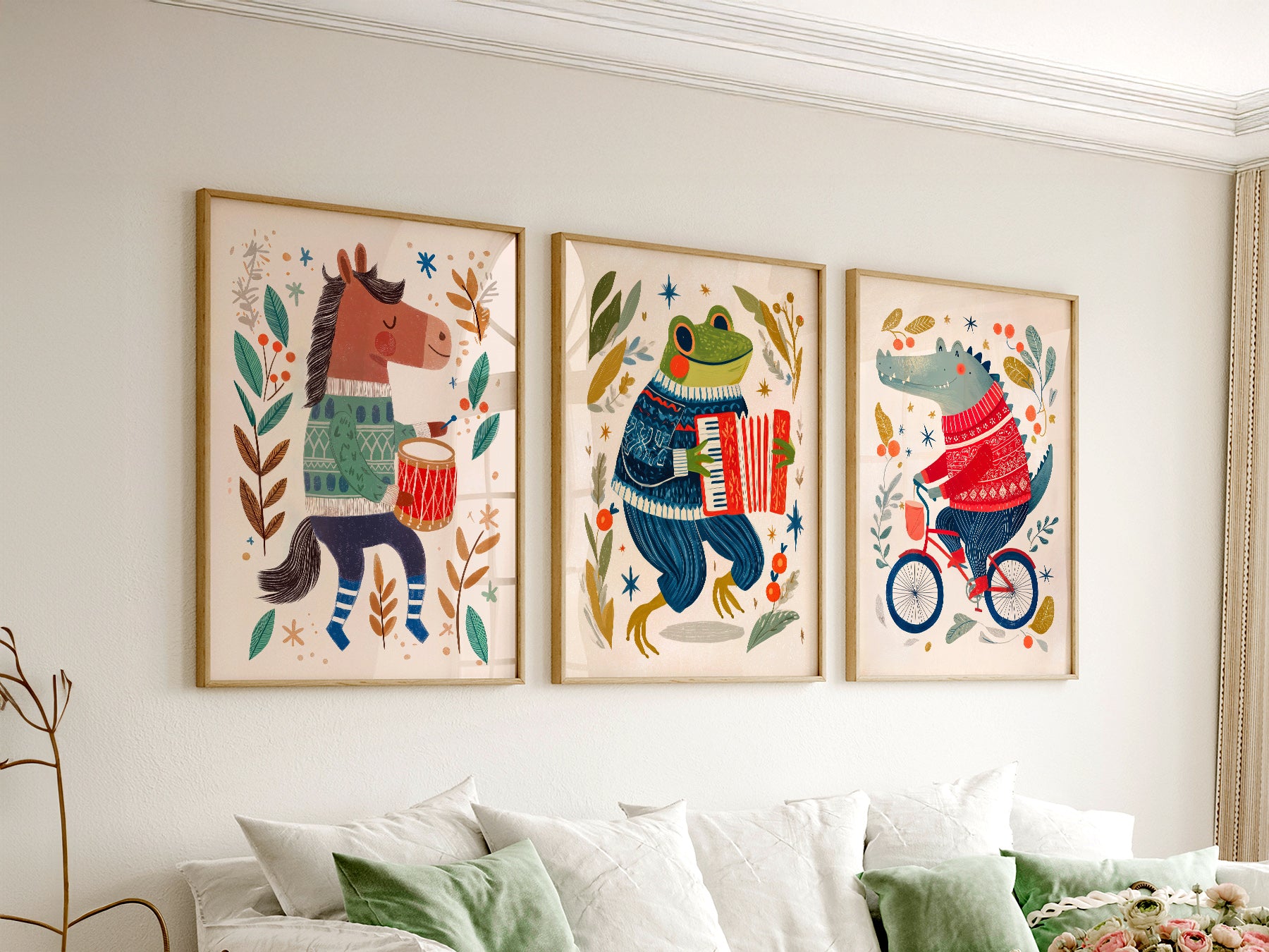 Bring a soft rhythm to your nursery with this sweet set of three playful prints. Featuring a friendly band of animals in their favorite cozy sweaters, this collection celebrates the joy of music and movement.