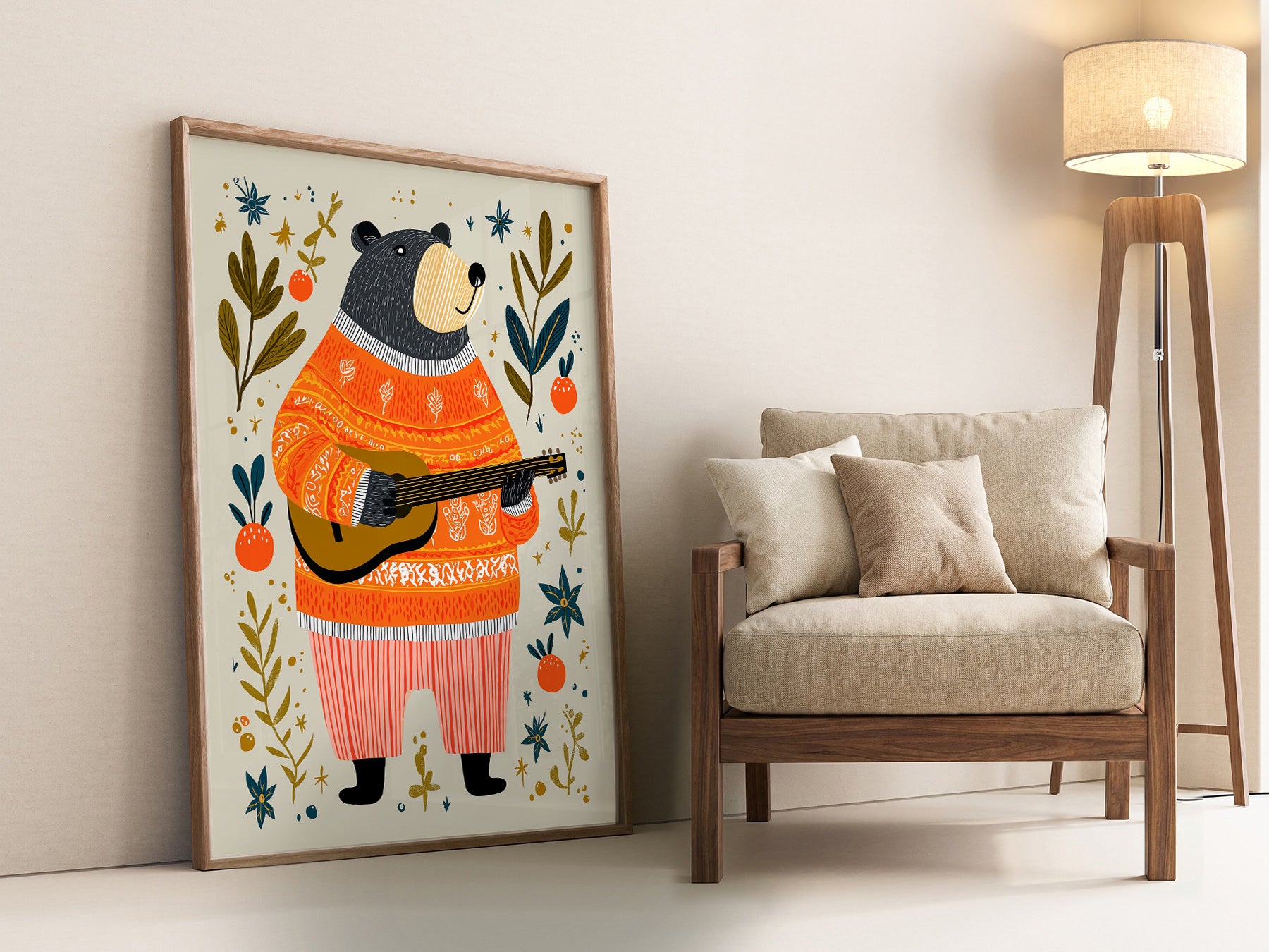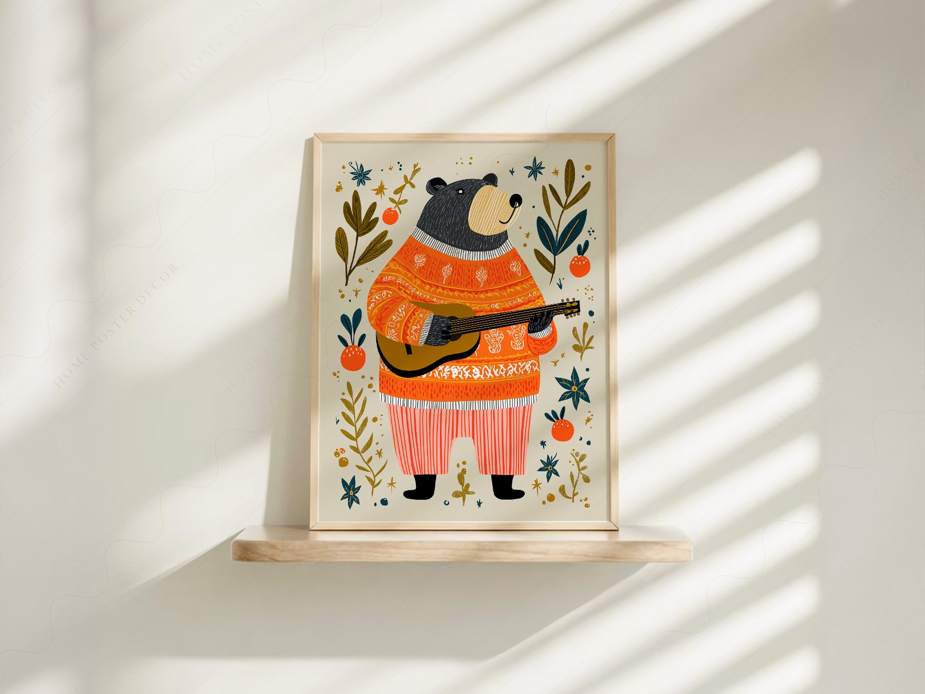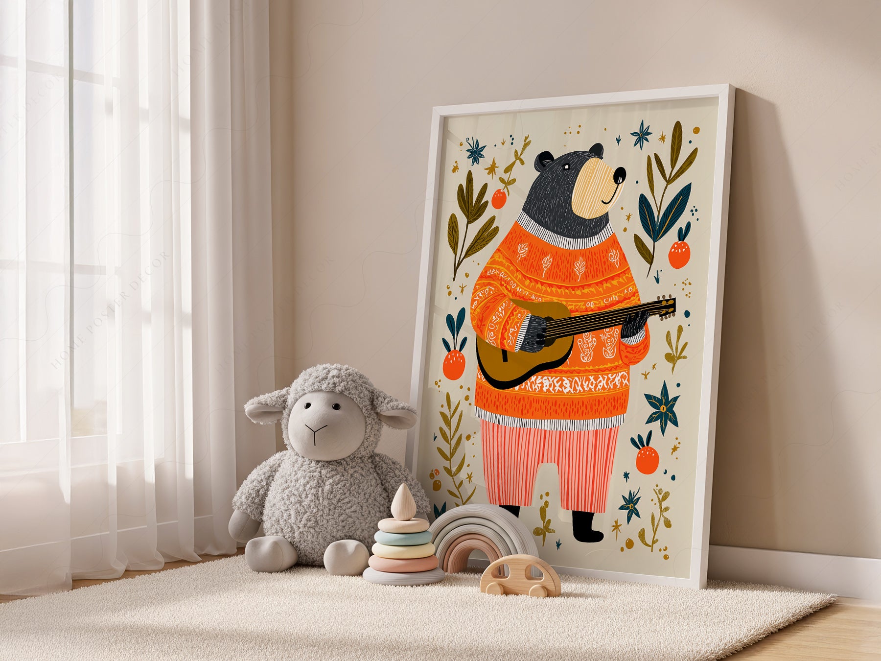 Add a rhythmic touch to your child's space with the Strumming Bear. This friendly black bear is all set for a campfire sing-along, dressed in a cozy, patterned orange sweater and cheerful red striped trousers while expertly playing his acoustic guitar.