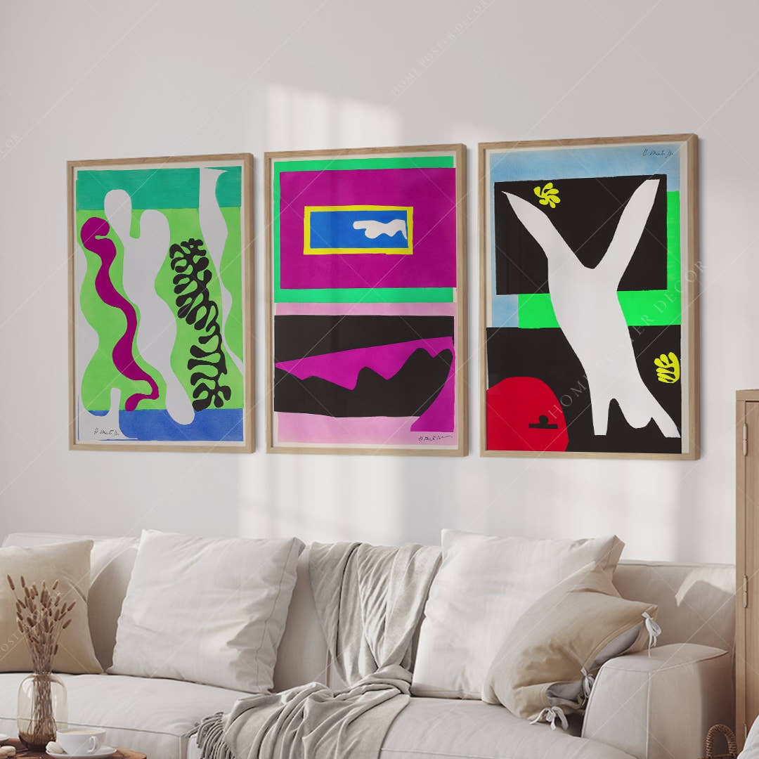 Brighten your space with a vibrant set of three colorful abstract Henri Matisse prints. These high-quality reproductions showcase his bold use of color, fluid shapes, and expressive forms, perfect for adding a touch of modern artistry and joyful energy to any room.