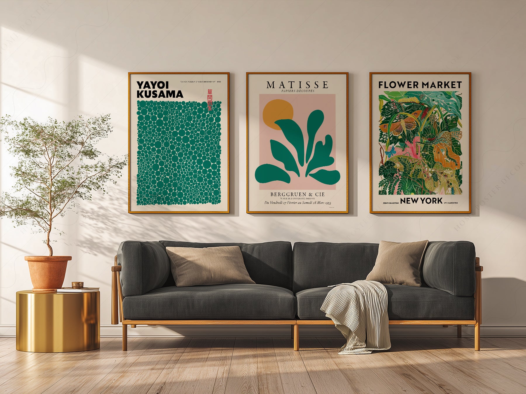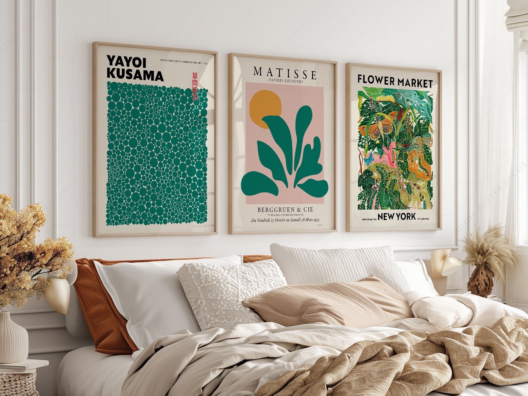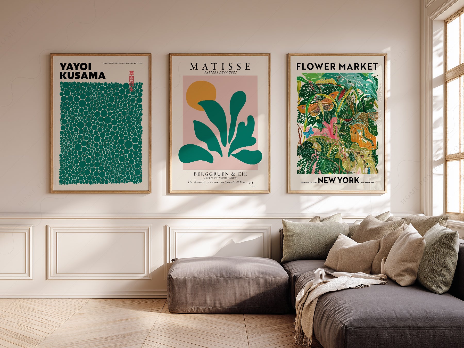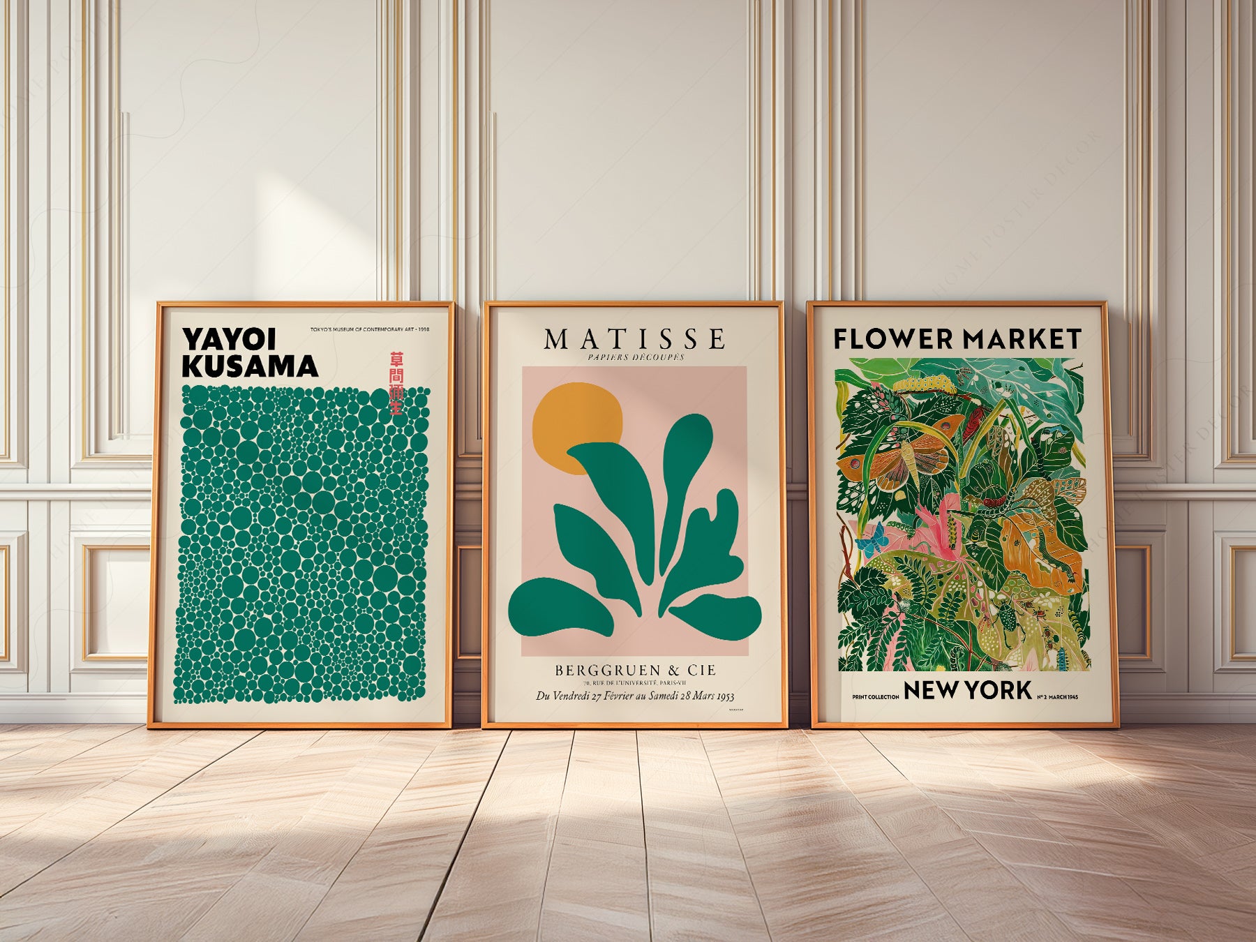 Henri Matisse and Yayoi Kusama are both known for their vibrant use of colors, and incorporating their artwork into a gallery wall can be a great way to infuse warmth and modern design into your decor. Additionally, a flower market theme can complement these artists' works nicely, as both Matisse and Kusama have explored floral motifs in their art.