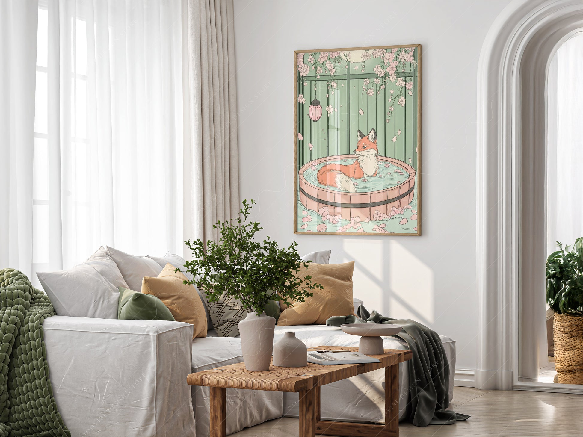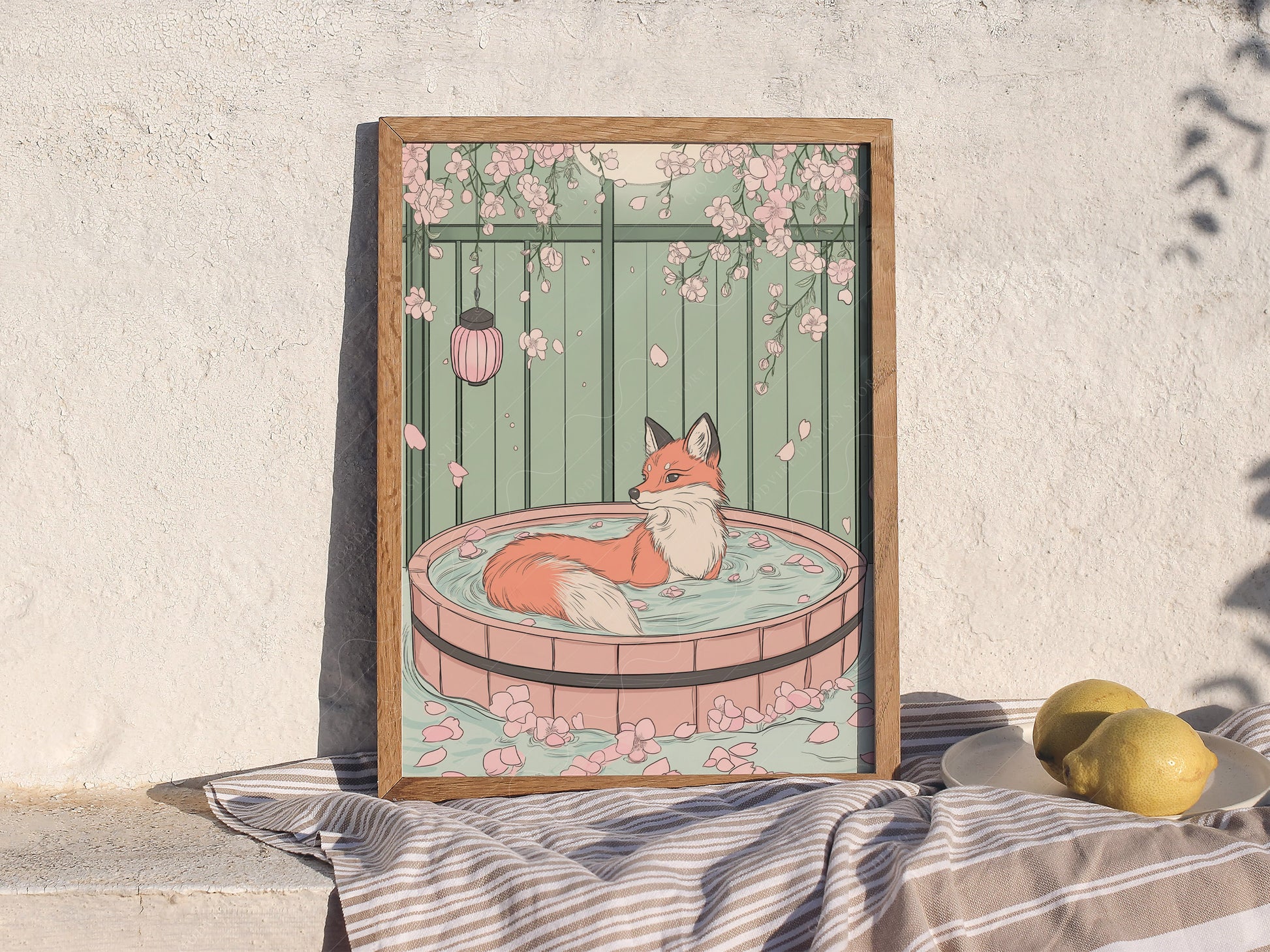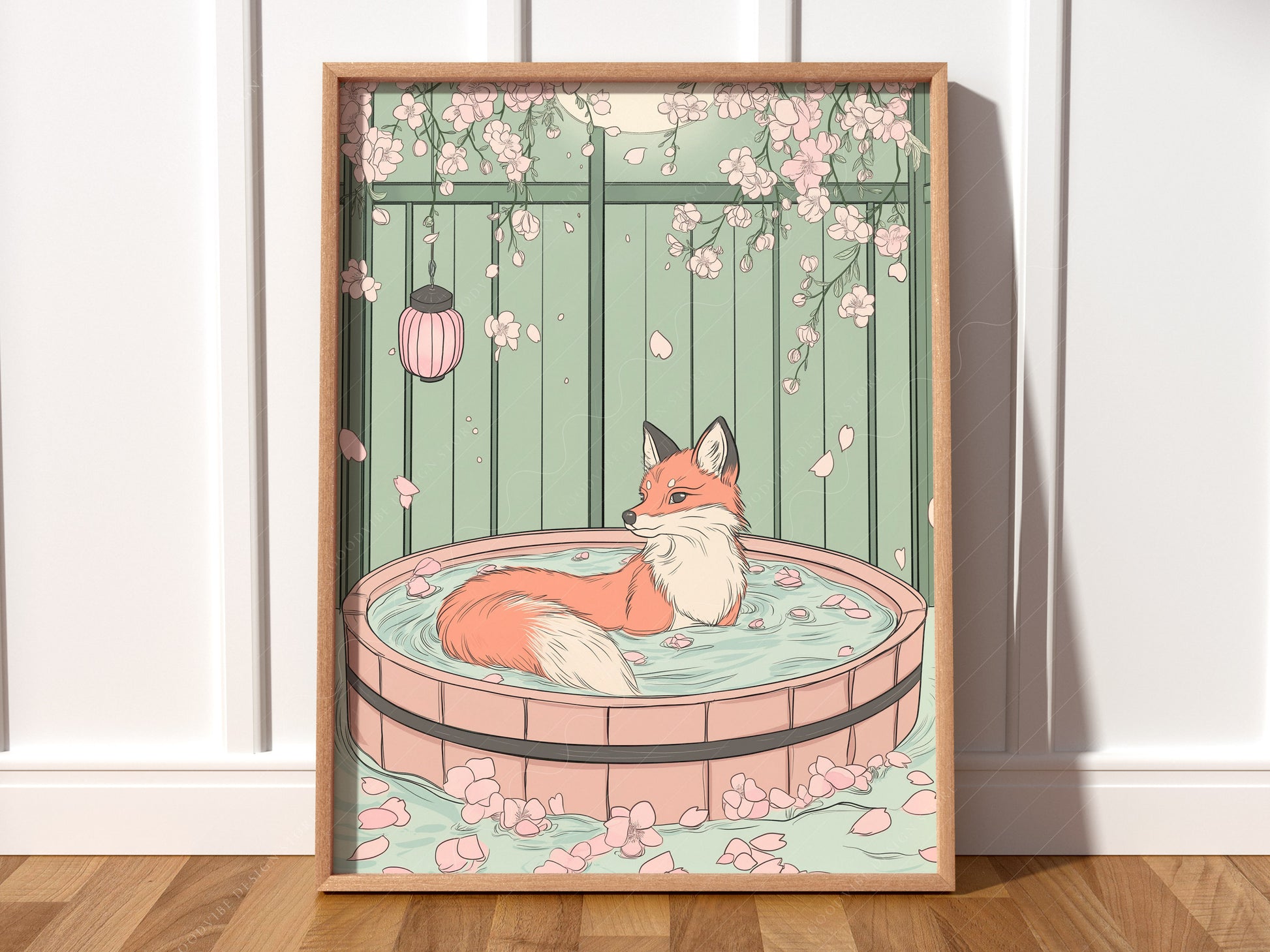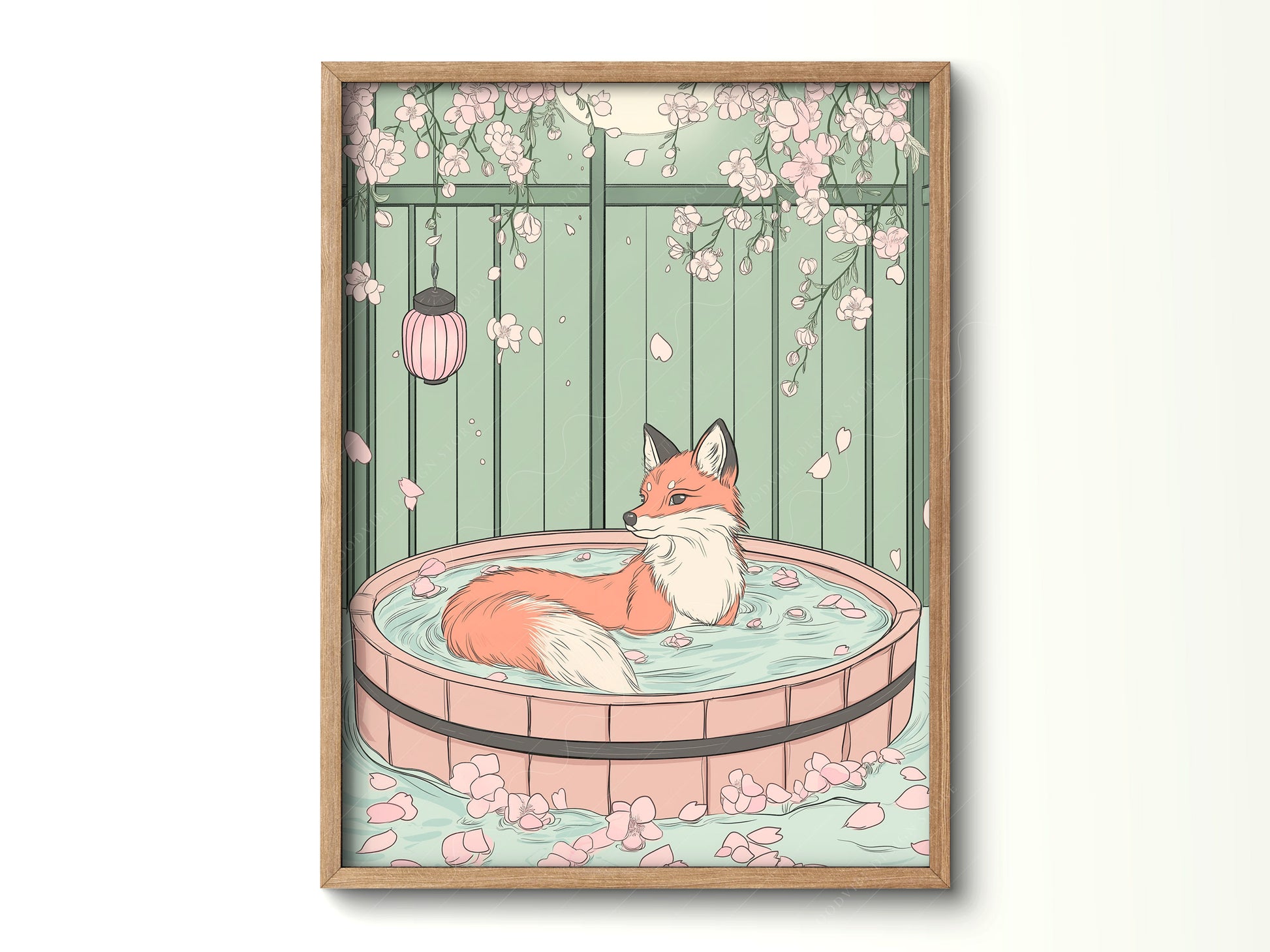 Find your moment of calm with our Spa Fox art print. Following the peaceful aesthetic of our popular Spa Cat, this illustration features a graceful red fox soaking in a traditional wooden tub filled with flower petals. Set against a soft sage-green garden backdrop with hanging cherry blossoms and a glowing lantern, it’s the ultimate piece for a relaxing home environment.