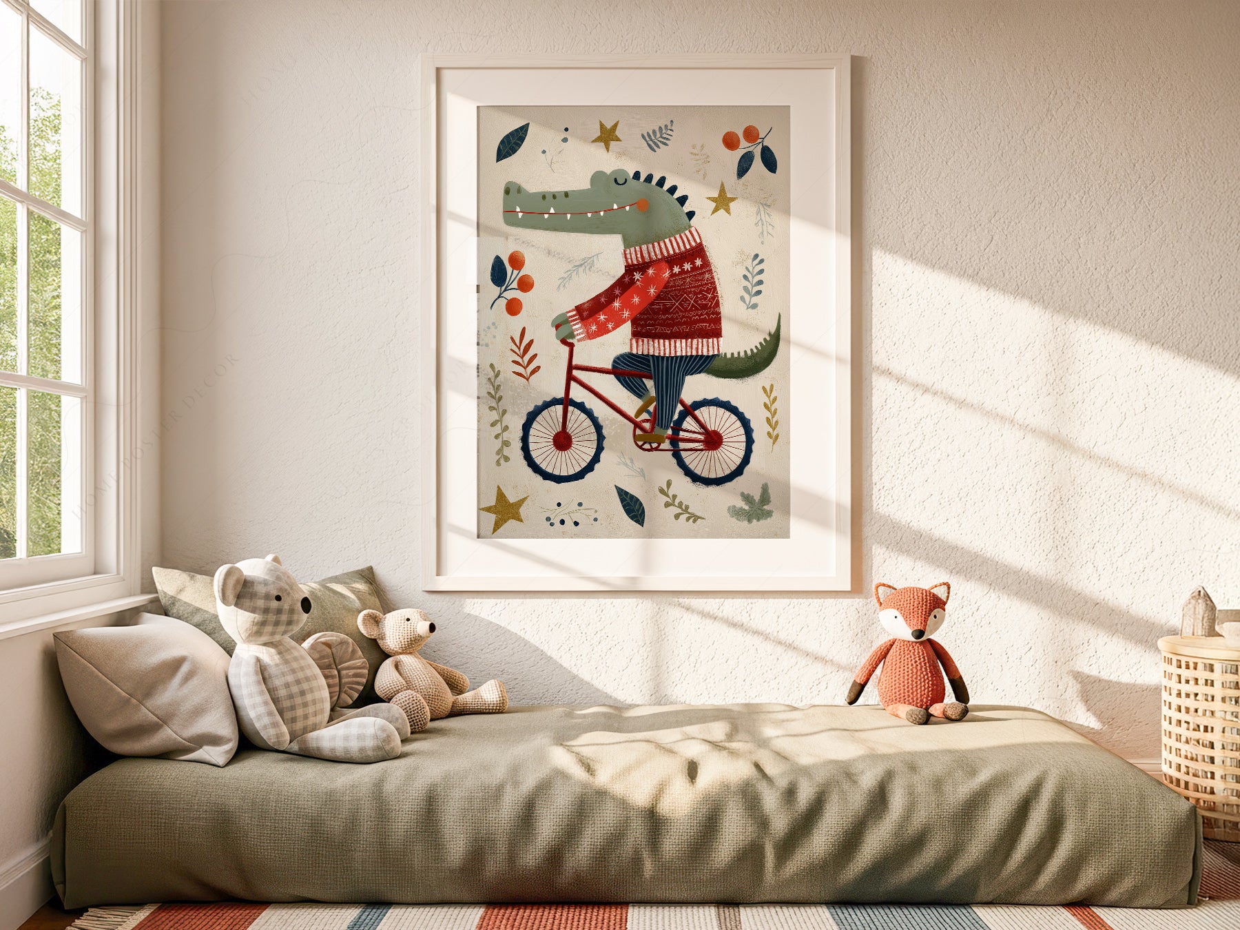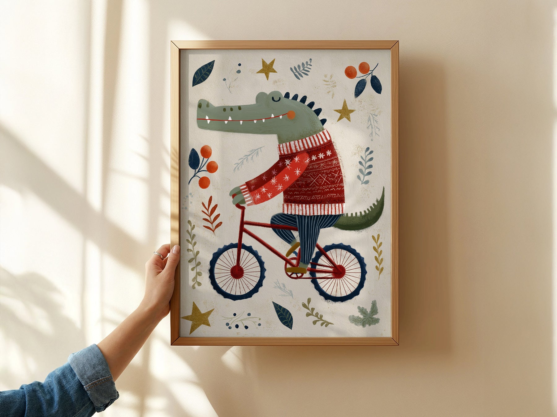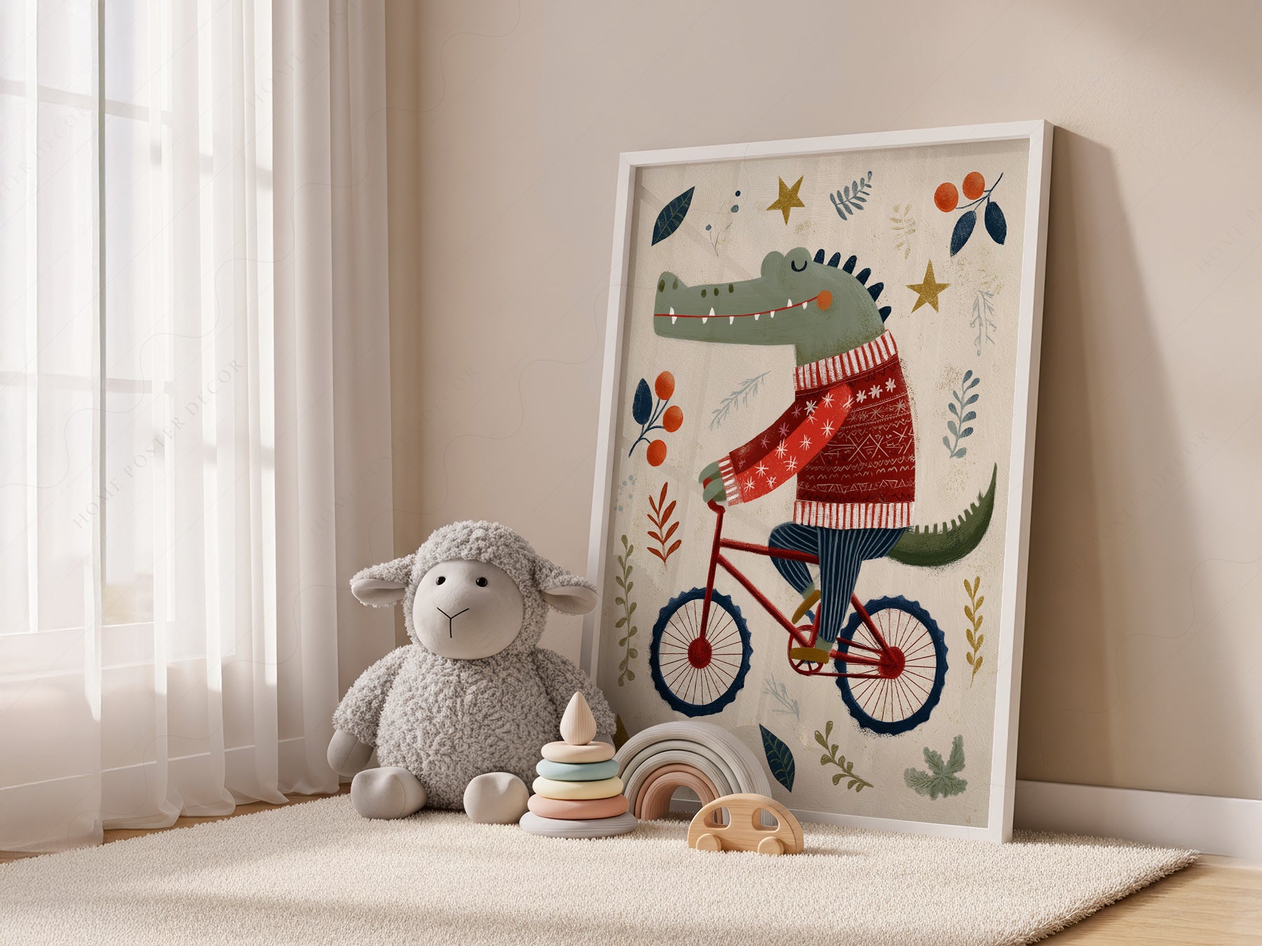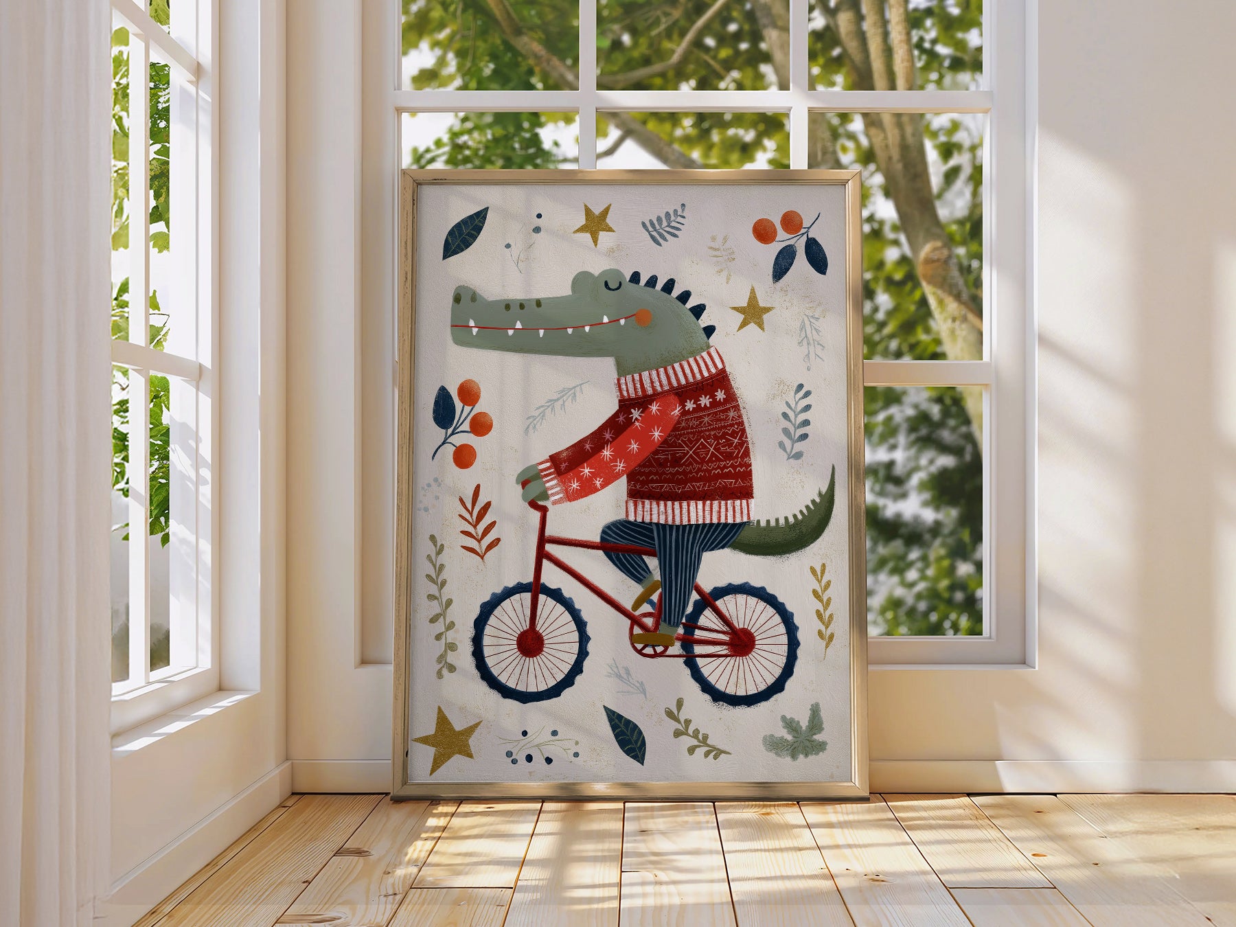 Pedal into fun with our Cycling Crocodile art print! Featuring a friendly croc in a festive red sweater, this vibrant illustration is perfect for a modern nursery or playroom.