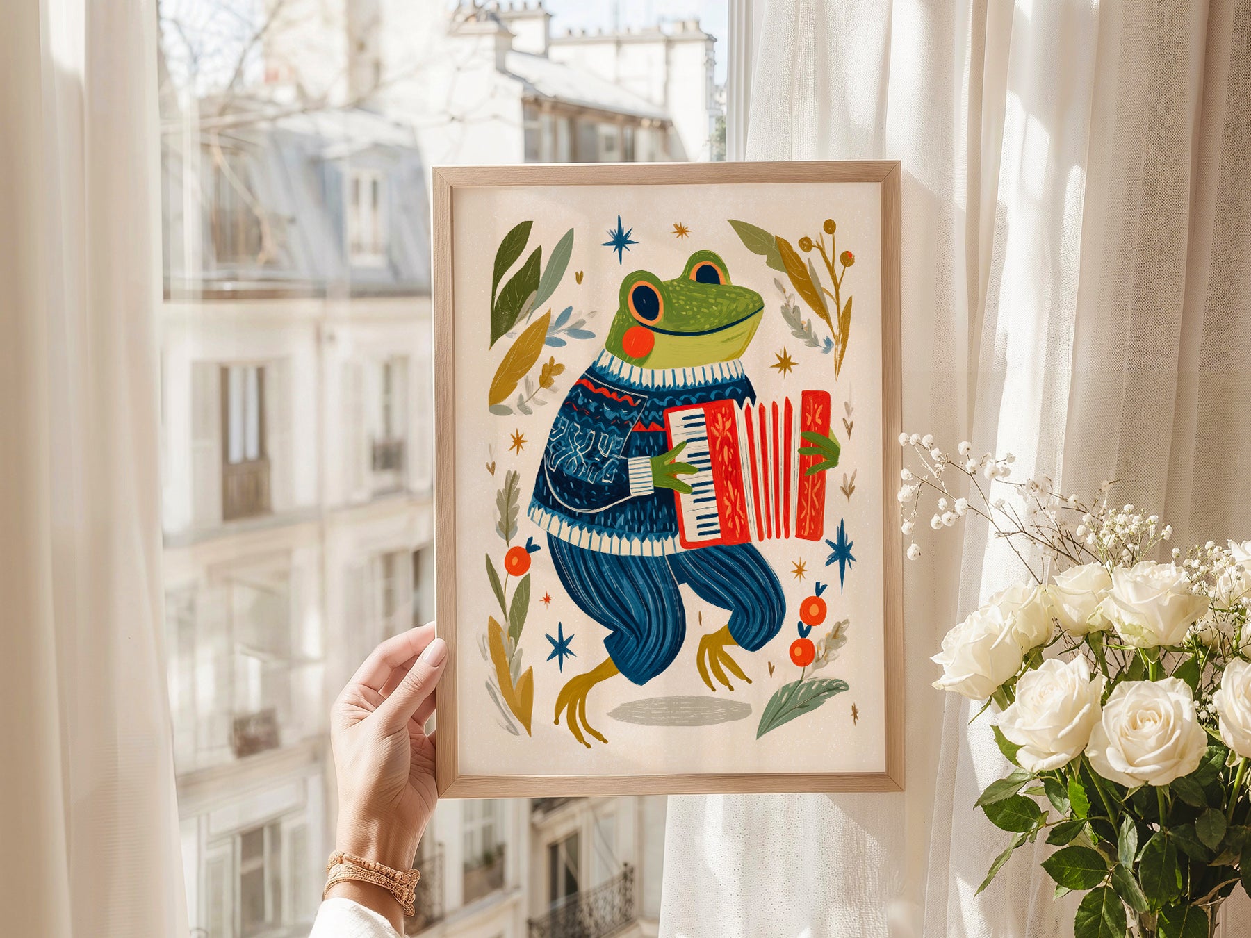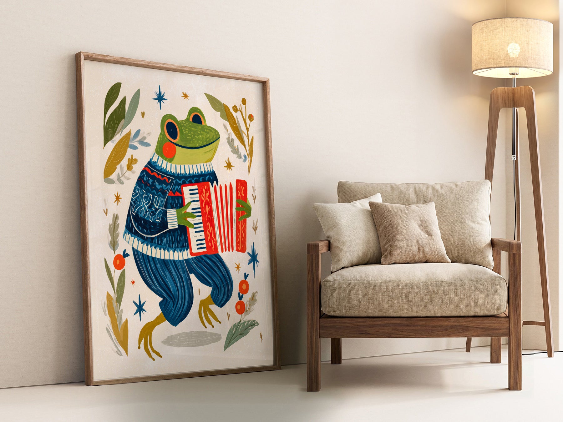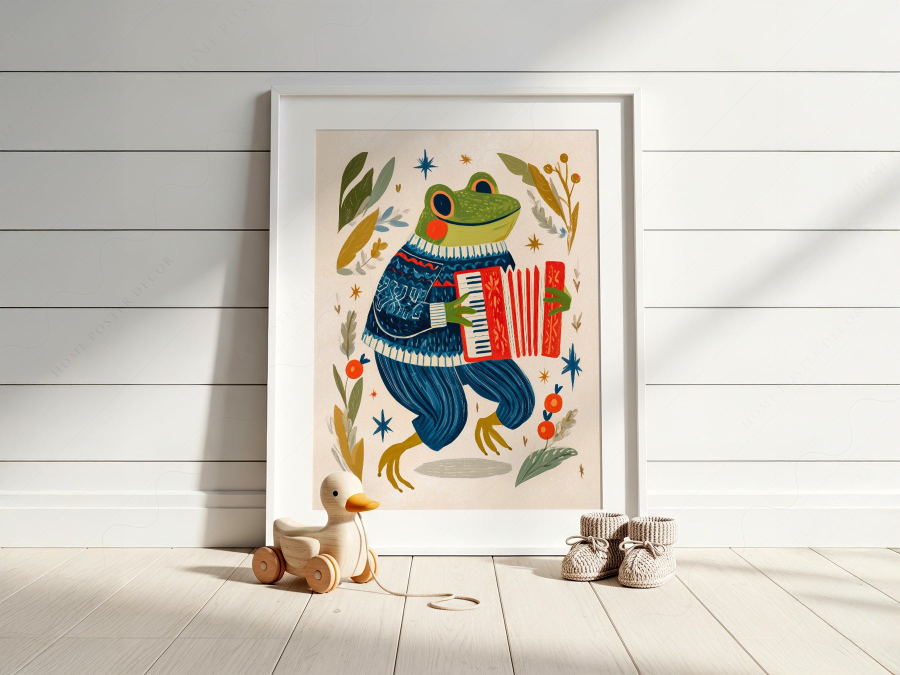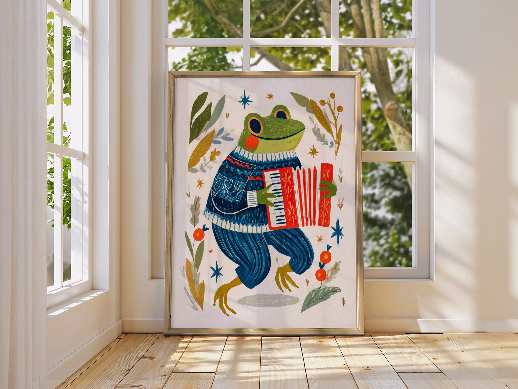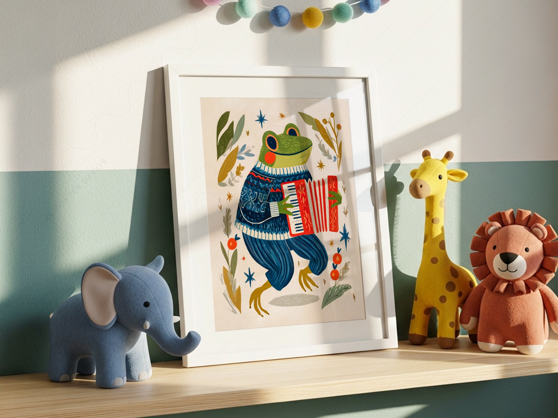 Add a joyful beat to your nursery with the Accordion Frog art print. A stylish green frog in a navy knit sweater playing a red accordion—perfect for a modern, music-themed playroom.
