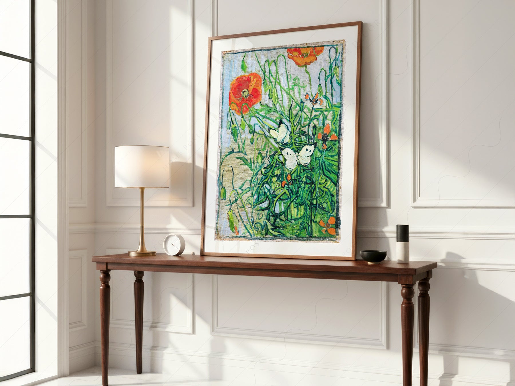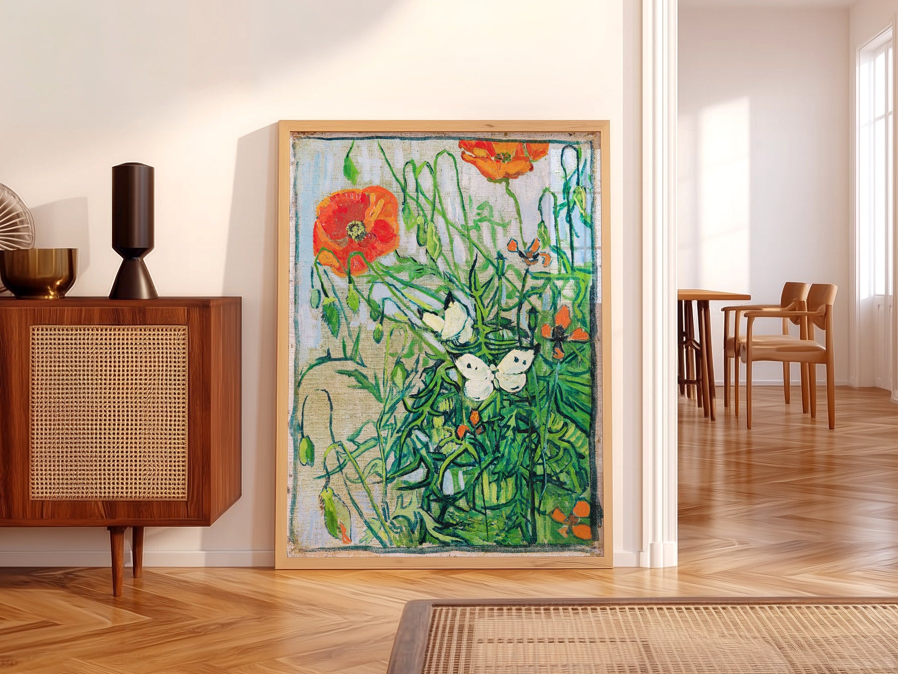 Van Gogh's Butterflies and Poppies captures a serene moment in nature, where delicate butterflies hover above a bed of vibrant poppies. The artist's distinctive brushwork and bold use of colour such as various shades of green, yellow and red creates an almost magical atmosphere.