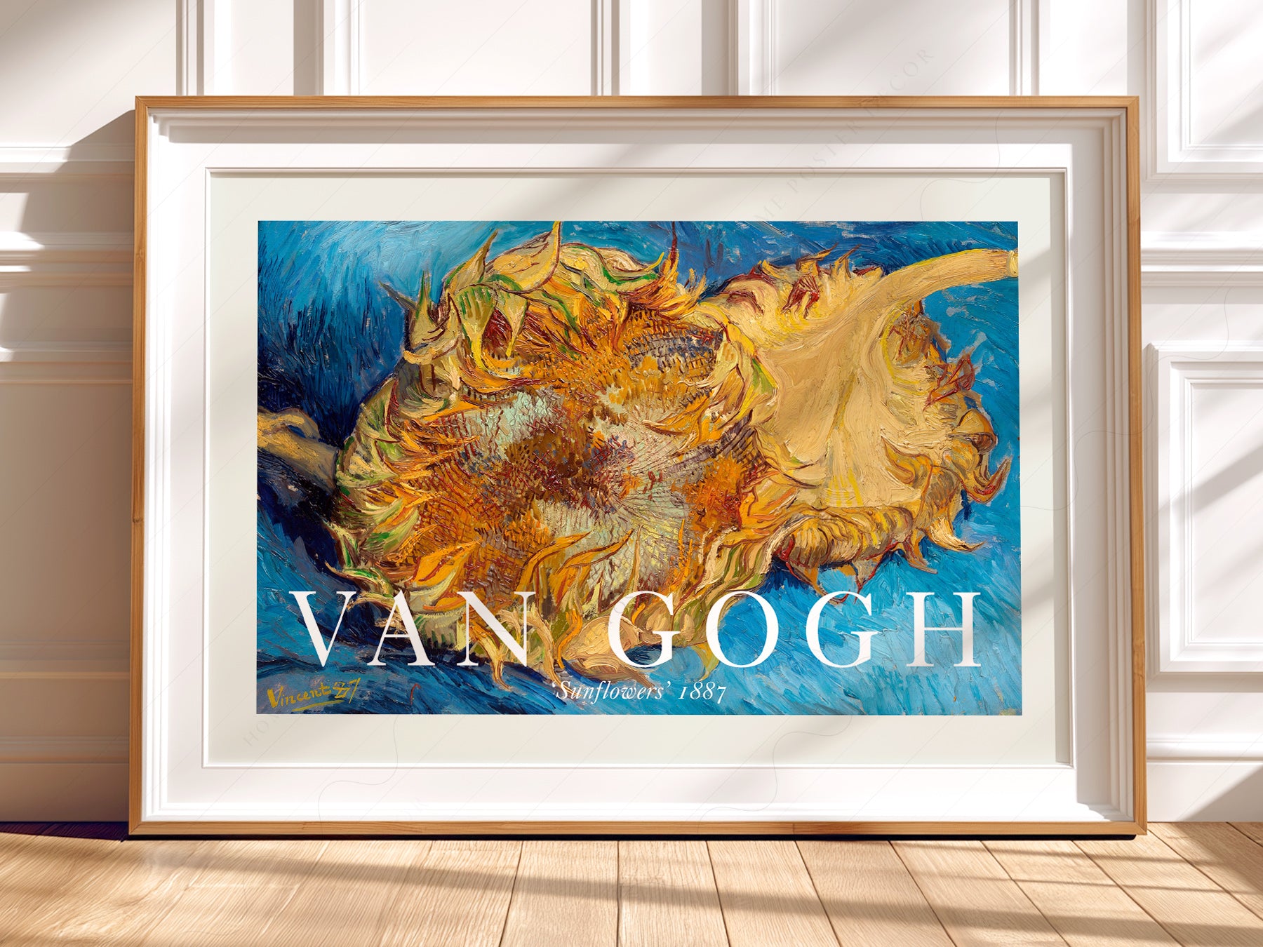 Van Gogh's painting Four Sunflowers Gone to Seed is a symphony of colours and textures. The expressive brushwork brings the sunflowers to life, even in their fading state. The rich, warm hues of orange, yellow and brown contrast with the deep blues of the background, creating a dynamic and visually arresting composition.