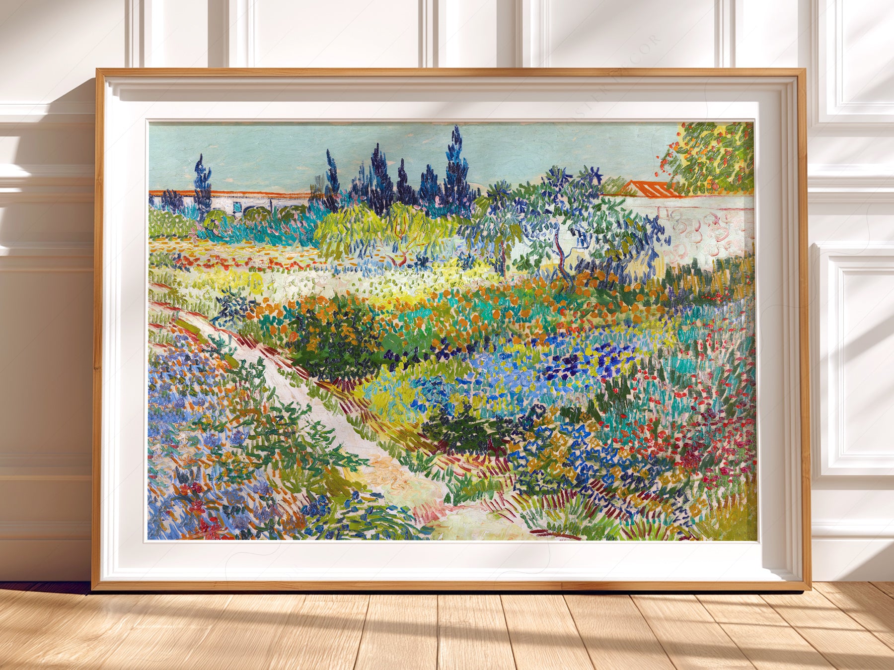 Van Gogh's Garden at Arles is a radiant testament to the artist's love for the natural world. His distinctive use of bold, swirling brushstrokes and a rich palette of colours breathes life into the scene, creating an almost dreamlike atmosphere. Bring a happy mood into your home with this art print, a celebration of nature's beauty and a reflection of Van Gogh's deep connection to the landscapes he inhabited.