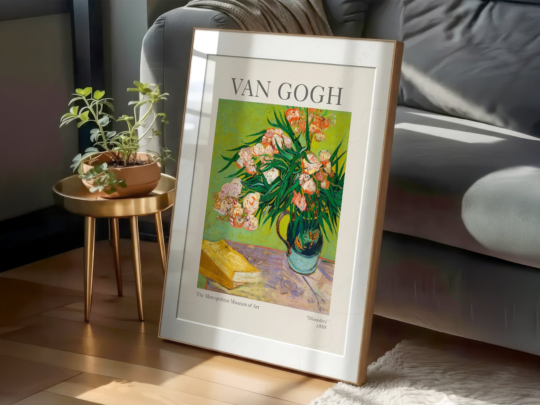 Van Gogh's "Oleanders" shows pink and white oleanders in a majolica vase popping against a radiant blue-green background. The artist's bold and expressive brushwork adds a sense of movement to the composition, capturing the essence of these Mediterranean flowers with an almost palpable energy.