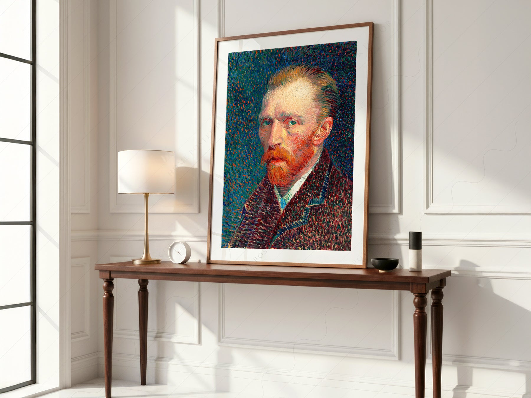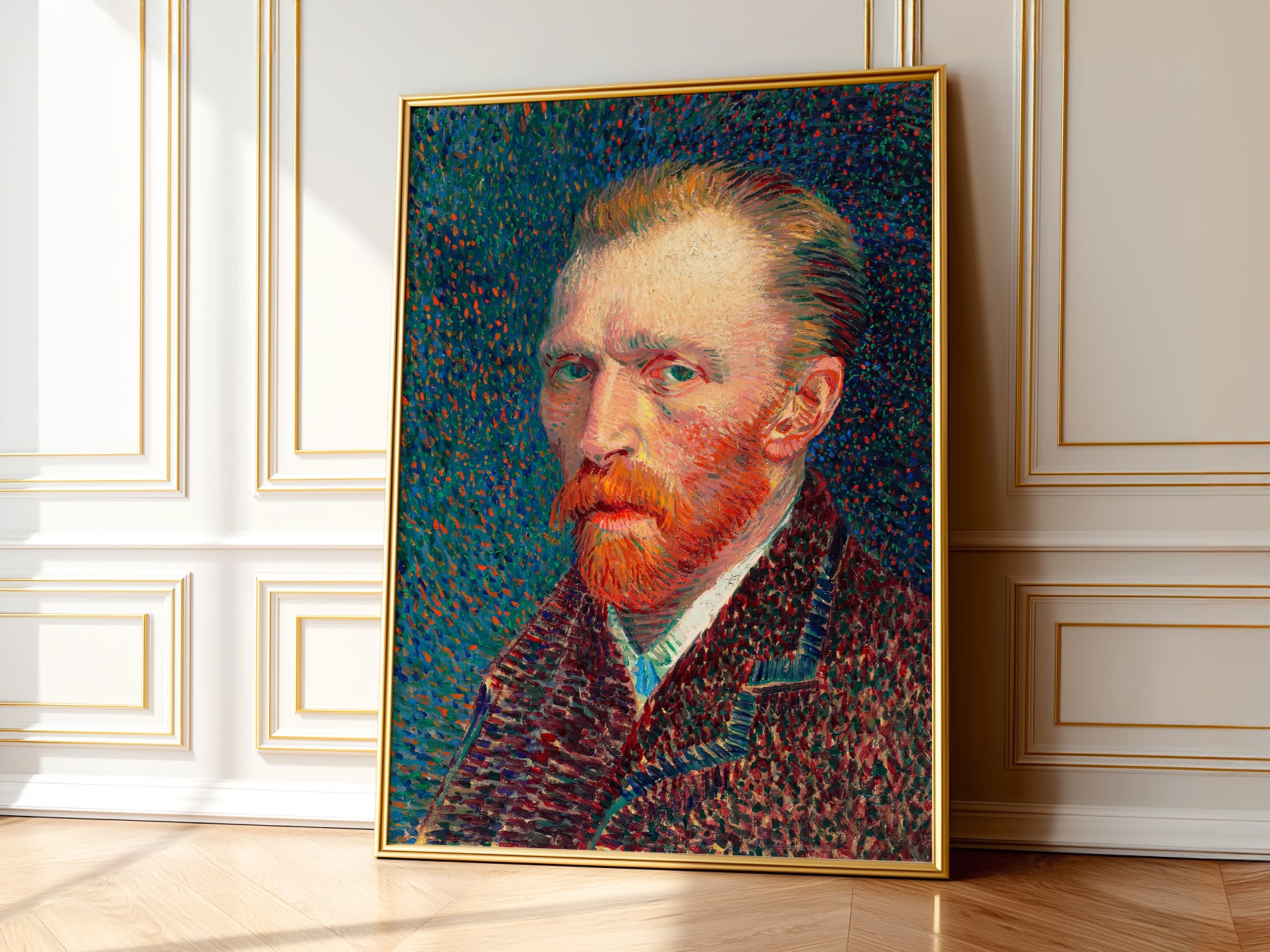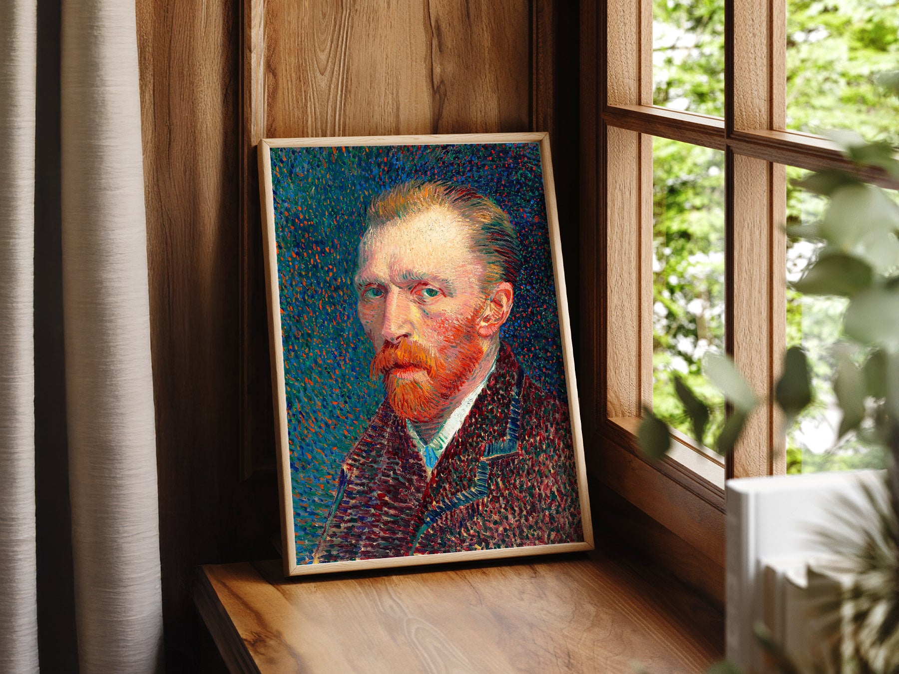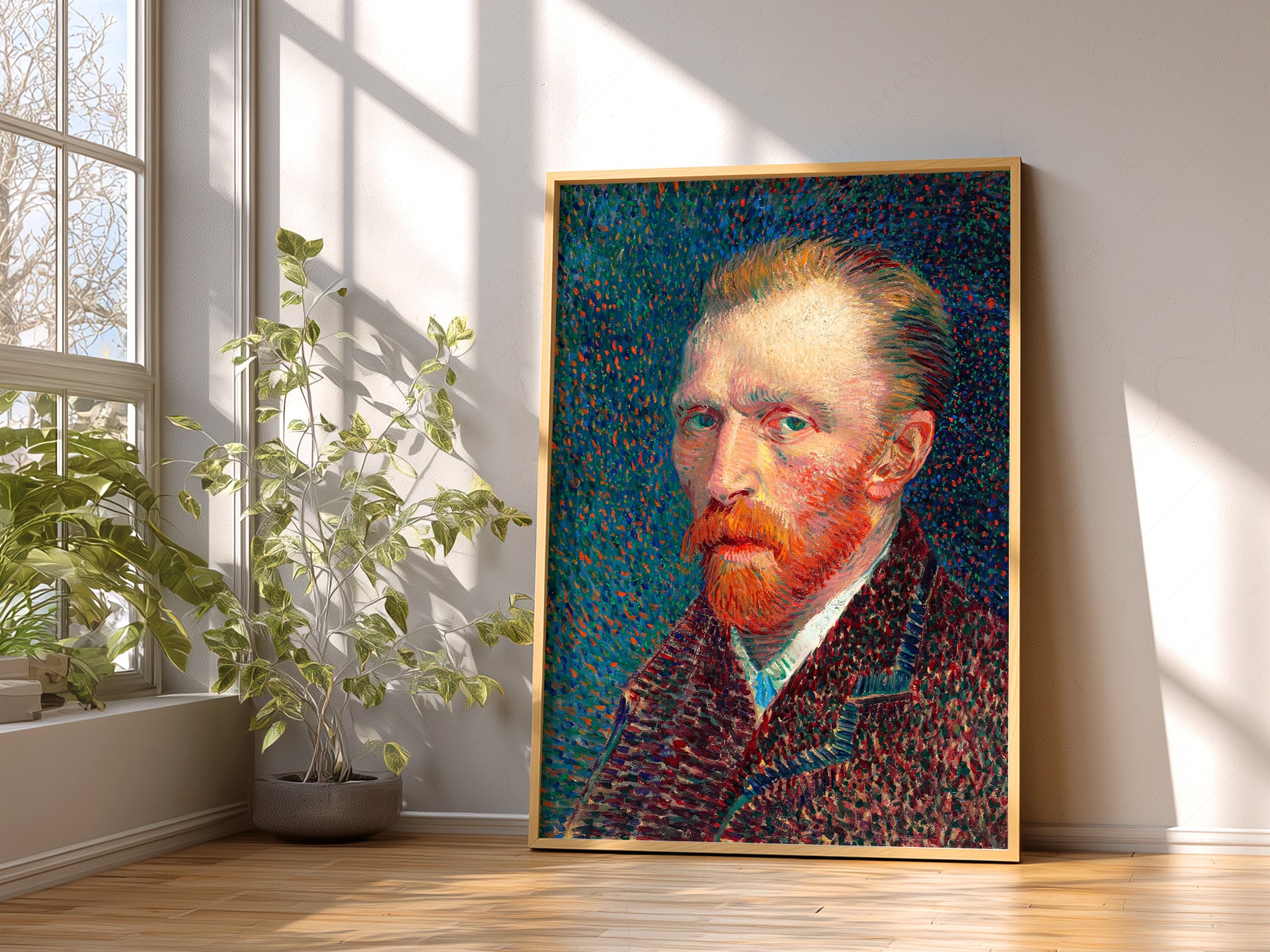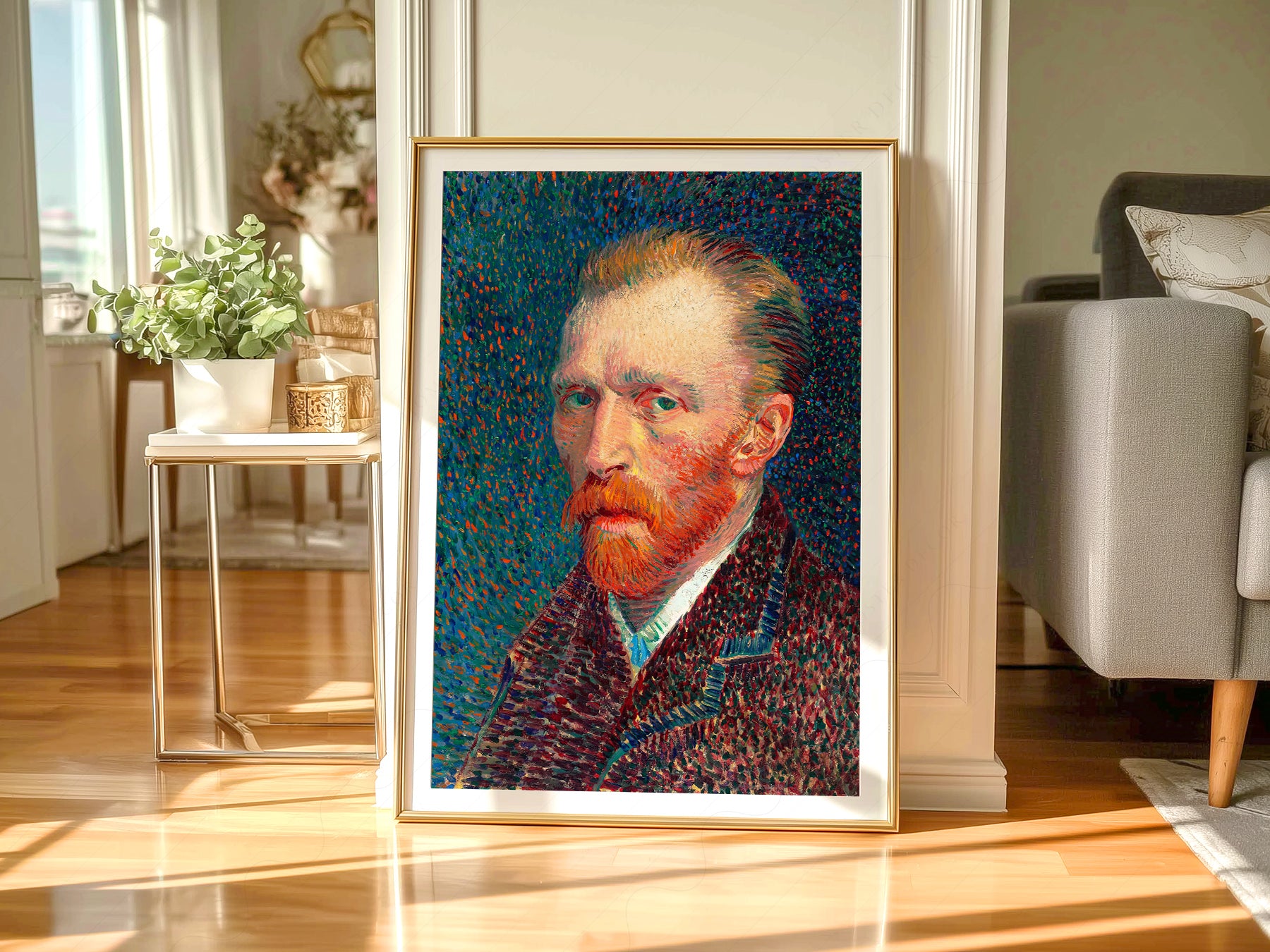 Vincent van Gogh's self-portraits are windows into his inner world, a powerful and introspective journey, offering viewers a glimpse into the mind of a tormented genius whose creative spirit continues to inspire and captivate the world. This high-quality print is one of our exquisite Van Gogh self-portraits that showcases intense greens, oranges, reds and blues brushstrokes.
