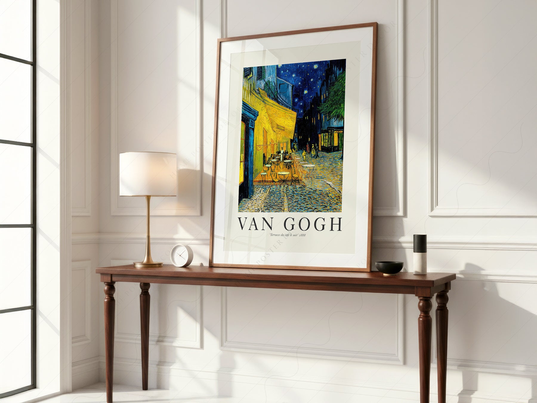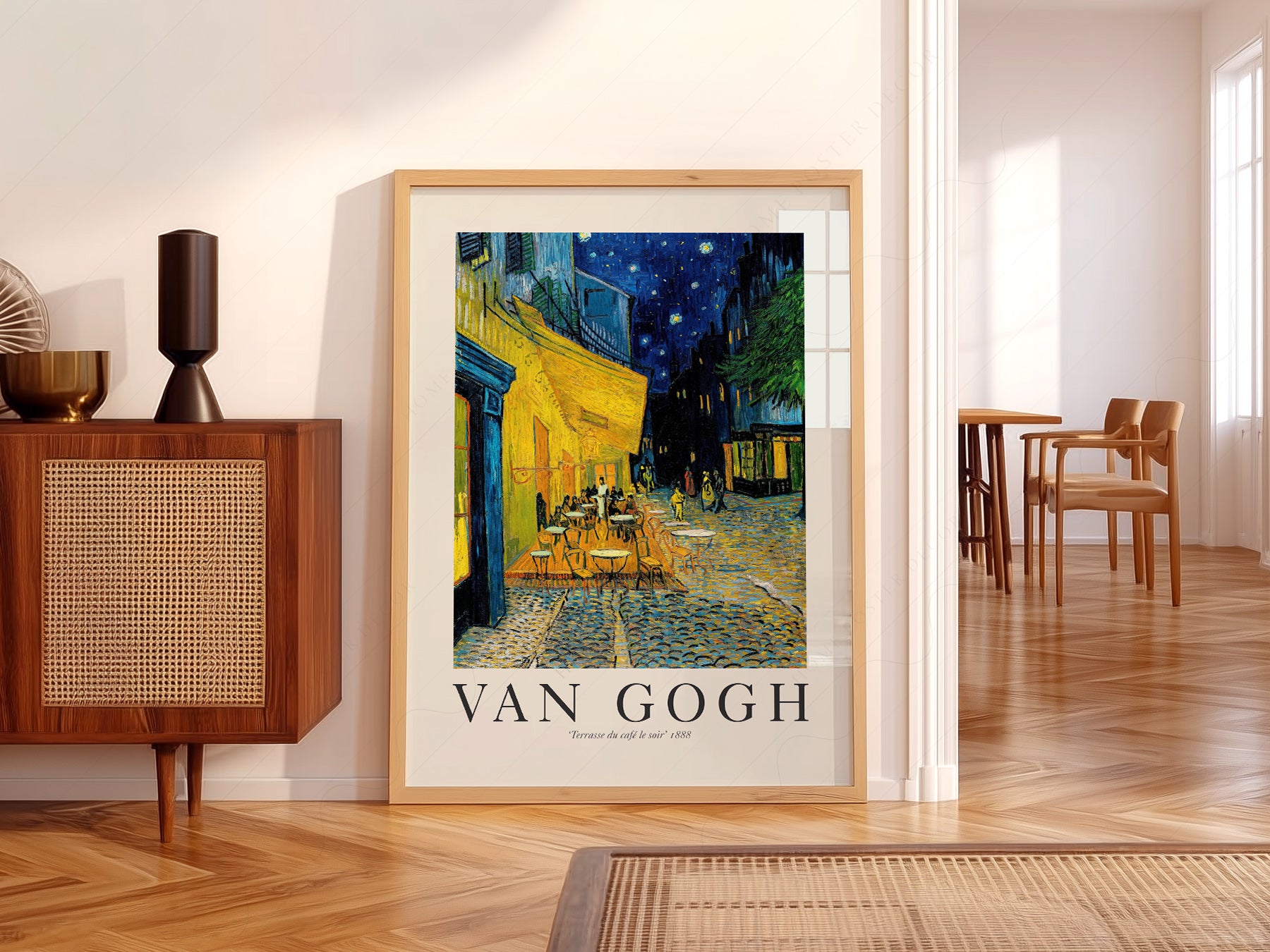Van Gogh's Café Terrace at Night is an eye-catching painting that captures the enchantment of a cozy evening at a bohemian French café, bathed in warm, inviting hues of yellow, green, orange and blue. You can bring this classic masterpiece into your home with our high-quality posters.